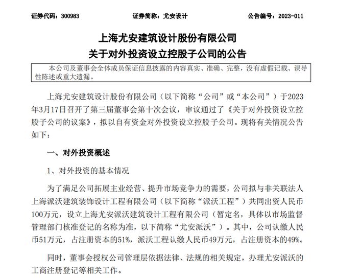 为了市场需求、提升市场竞争力,上海派沃建筑装饰设计工程有限公司与上海尤安建筑设计股份有限公司(股票简称:尤安设计,股票代码:300983)共同出资设立控股子公司,上海尤安派沃建筑设计工程有限公司(以下简称尤安派沃)。