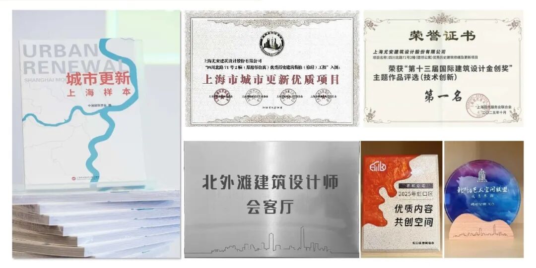 上海德邻公寓在城市更新从“大规模增量建设”转向“存量提质改造”的关键阶段中所进行的创新实践,为上海存量历史建筑的可持续活化提供了系统解决方案与可推广的实践范本。迄今为止,上海德邻公寓已获得来自行业和政府的双重认可,不仅作为优秀案例入选《城市更新·上海样本》,入选上海市城市更新优质项目,荣获第十三届国际建筑设计金创奖第一名,并被授予“北外滩建筑设计师会客厅” “互联网优质内容共创空间”“北外滩艺术空间联盟成员单位”等荣誉。