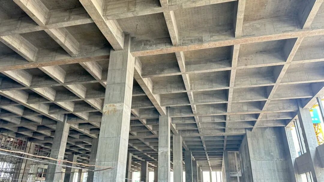 从项目启动之初,施工难题便十分突出。项目地上层高多变,1-2层达 10.5米、3-6层为 6.0米、7层至顶层为4.5米,项目要求地上结构全铝模施工。其中10.5米层高的超高大支模施工,在国内采用铝合金模板并实施快拆工艺的案例中极为罕见;再加上柱子尺寸大、加固难度高,现场场地有限且工期紧张,传统铝模支撑工艺完全无法满足需求。