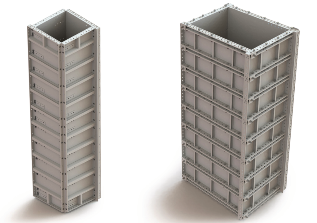 ? 首发新品——铝合金可调柱模体系:作为本次展会的 “明星产品”,该体系采用 63.5 系统铝合金模板制成,通过模板背面开孔与连接构件搭配,可拼装成独立矩形柱,无需额外抱箍背楞,大幅提升人工安装效率。产品分为通高型与加高型两类:通高型针对截面≤600mm 的柱子,无需加固仅需打销钉、斜撑,安装速度提升 50%,且拼缝少、成型质量高,模板重量轻可人工搬运,降低运输成本;加高型适配截面≤800mm 的柱子,由标准模板组合而成,可拆装调节高度,无需背楞或拉片加固,减少材料投入 30%,适用于超高层建筑等多场景。两类产品均具备标准化程度高、可重复使用、快速周转、绿色环保等优势,可满足独立矩形柱截面变化结构的施工需求。