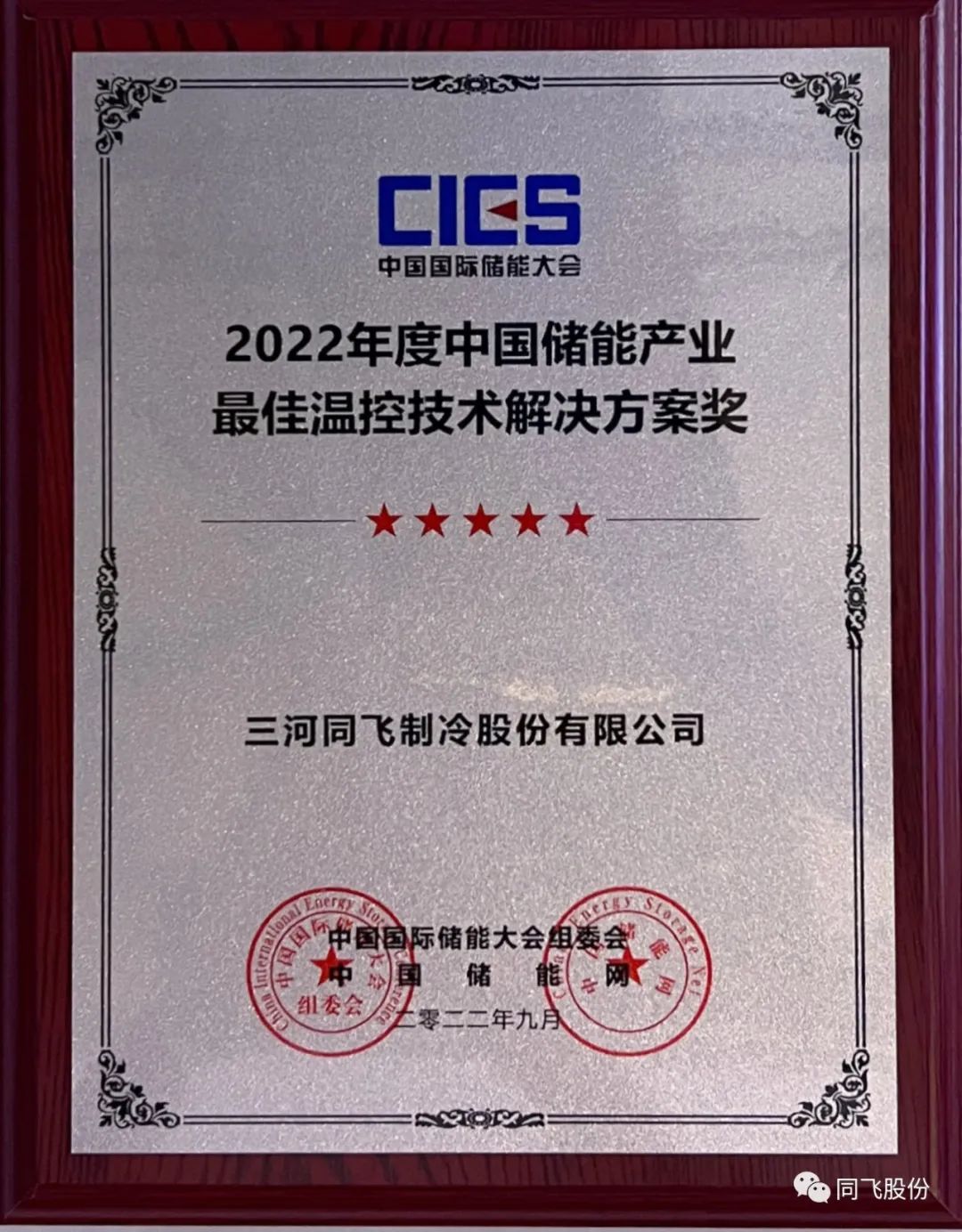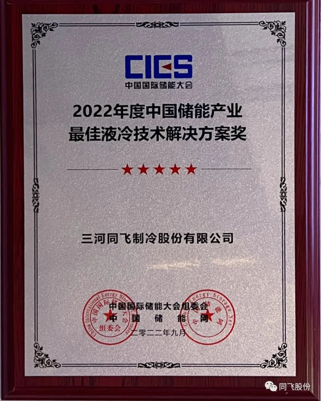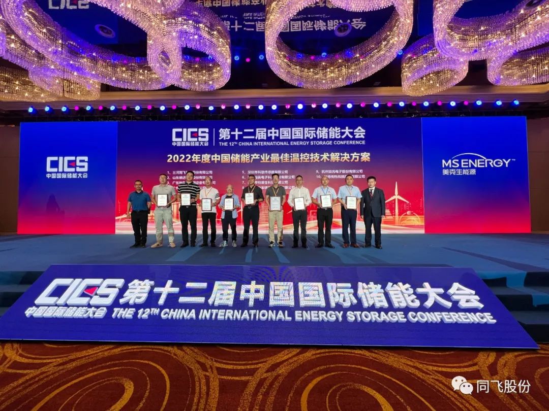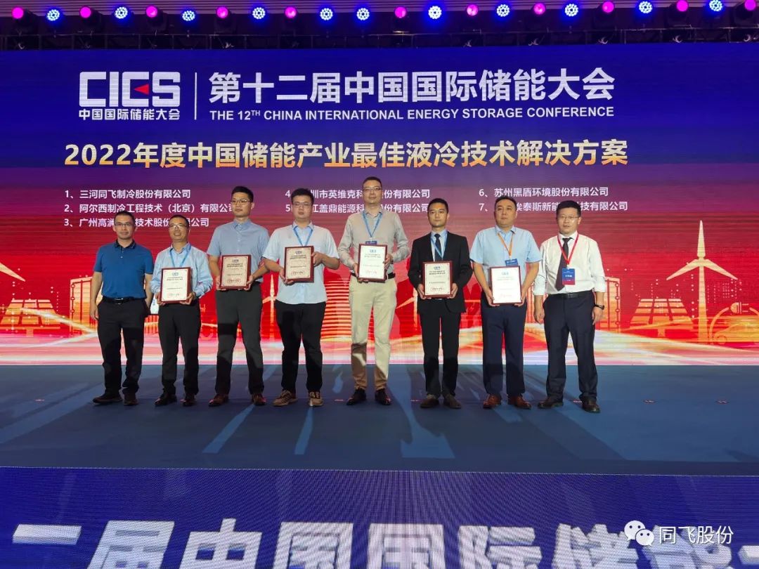 本次储能大会中,三河同飞制冷股份有限公司,凭借多年工业温控领域的成熟经验,荣获“2022年度中国储能产业最佳温控技术解决方案奖”和“2022年度中国储能产业最佳液冷技术解决方案奖”。