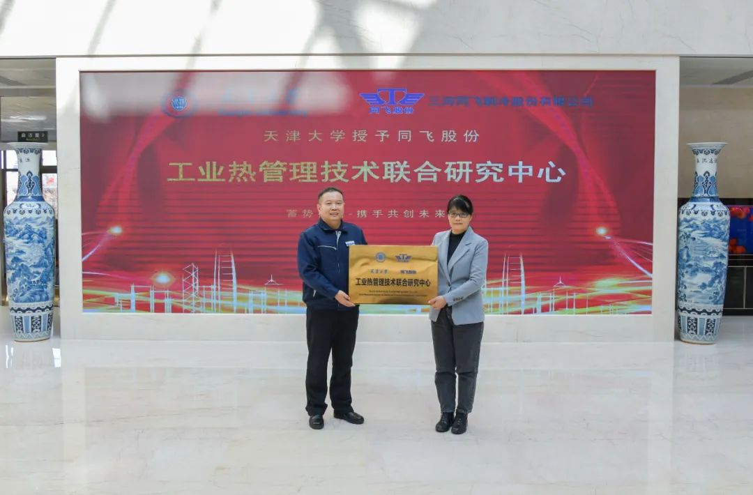 2月20日,天津大学机械工程学院与同飞股份共建“工业热管理技术联合研究中心”及“产学研基地”授牌仪式在三河同飞制冷股份有限公司举行。天津大学机械工程学院党委书记孙月海、副院长刁海、李敏霞教授等领导,同飞股份公司总经理张浩雷、常务副总经理高宇、行政总监安艳艳等领导及员工代表共同出席见证了仪式。