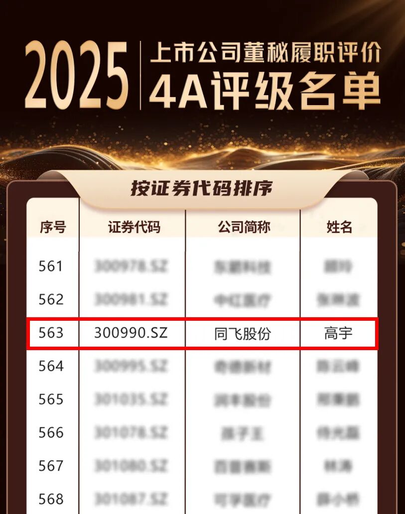 同时, 同飞股份 董秘高宇在“2025上市公司董事会秘书履职评价”中荣获4A评级,彰显了其在公司治理、信息披露、投资者关系管理等核心领域的专业水准与出色表现。