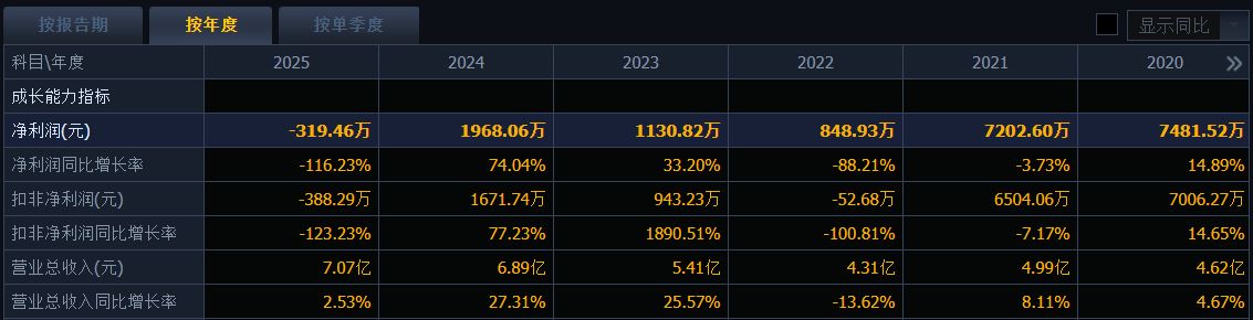 4月22日晚间,公司同步披露了2025年报。该年度公司实现总营收7.07亿元,同比增长2.53%;自2021年上市以来,除2022年营收有所下降外,其余年份营收整体呈稳步增长态势,从2021年的4.99亿元增长至2025年的7.07亿元,增幅达41.68%。