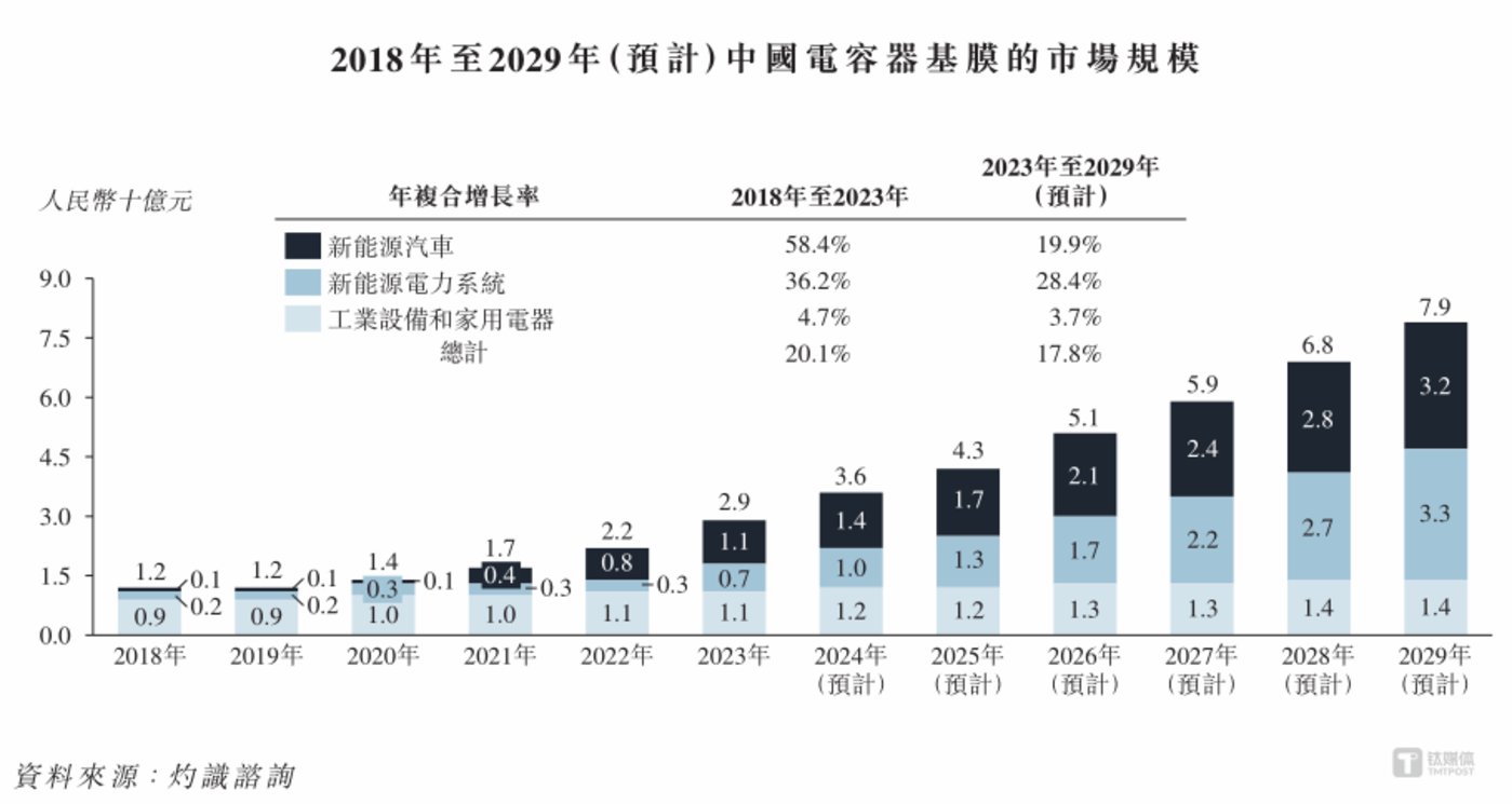 灼识咨询提供的数据,则进一步给电容膜行业近十年的发展进行了量化:2018年~2023年,中国电容器基膜市场的规模由12亿元增长到29亿元,年复合增长率为20.1%,预计到2029年将达到79亿元,年复合增长率为17.8%;从产量方面来看,由2018年的4.5万吨增至2023年的9.56万吨,年复合增长率为16.3%,预计到2029年将达到23.28万吨,年复合增长率为16.0%。
