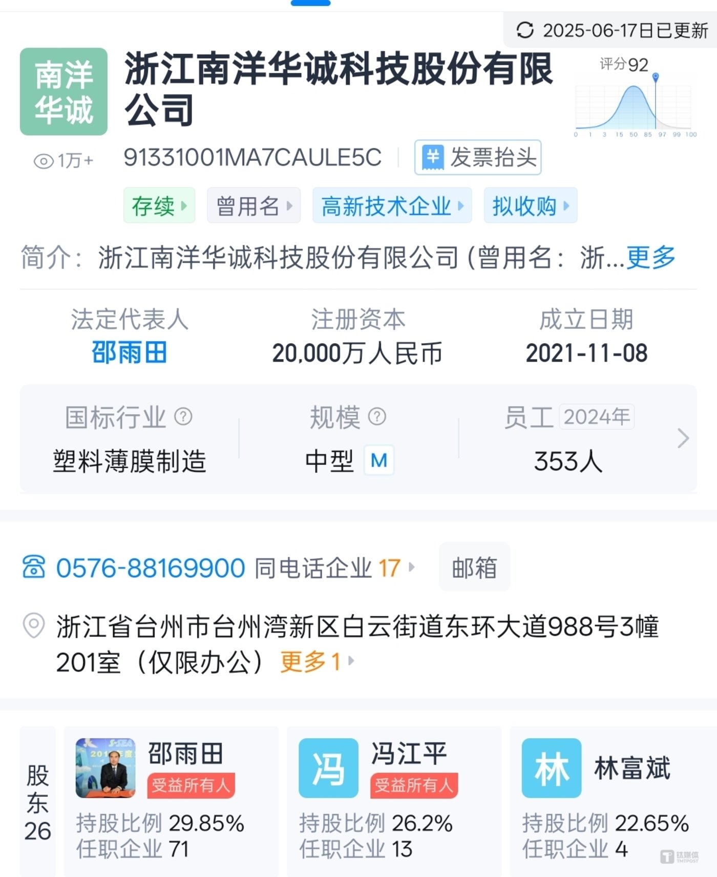 2025年7月9日,主营水泵制造的泰福泵业(300992.SZ)宣布收购浙江南洋华诚科技股份有限公司(曾用名:浙江南洋华诚科技有限公司,以下简称“南洋华诚”)51%以上股权。鉴于有“牛散”之称的邵雨田本人是泰福泵业的前十大股东,而南洋华诚则由邵雨田家族掌控,此次并购构成关联交易。