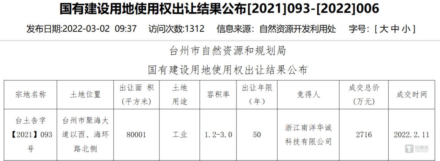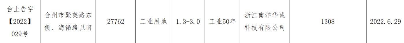 笔者从台州市自然资源和规划局曾经公布的信息中查询到,2022年南洋华诚接连在2月份和6月份购入两块工业用地,分别斥资2716万元,拿下聚海大道以西、海环路北侧80001平方米的工业用地和花费1308万元,将聚英路东侧、海循路以南27762平方米的工业用地收入囊中。