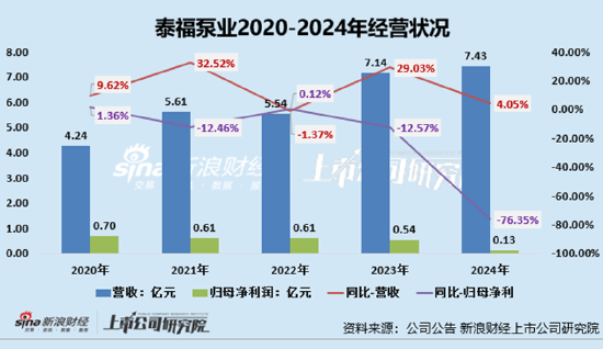 作为深耕民用水泵领域三十余年的泰福泵业,曾凭借海外市场扩张与产品多样化策略崭露头角。然而,近年来其营收增速放缓与净利润的断崖式下跌,暴露出企业发展路径中潜藏的多重隐忧。2024年,公司营收微增4.05%,归母净利润却同比下降76.35%。