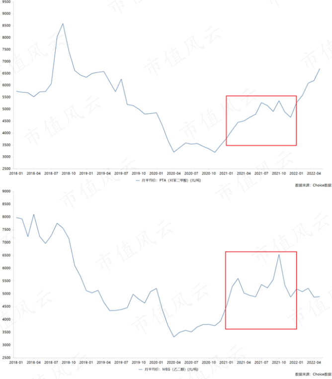 原因就是上游原材料PTA(对苯二甲酸)与MEG(乙二醇)的价格下降,聚酯纤维的采购价与上游原材料价格呈现相同的走势。