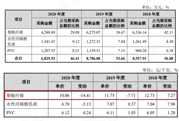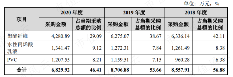 直接材料中又以聚酯纤维、水性丙烯酸乳液、聚氯乙烯(PVC)为主要部分。