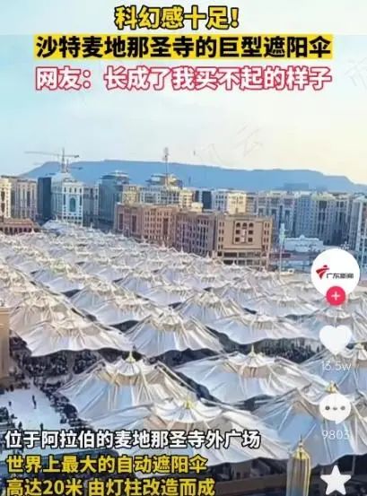 这几天风云君上班摸鱼的时候,在抖音里看到了一个很有意思的视频:沙特的那群土豪们总是嫌钱太多占地方,于是在麦地那圣寺旁的广场上修了200多个遮阳伞。