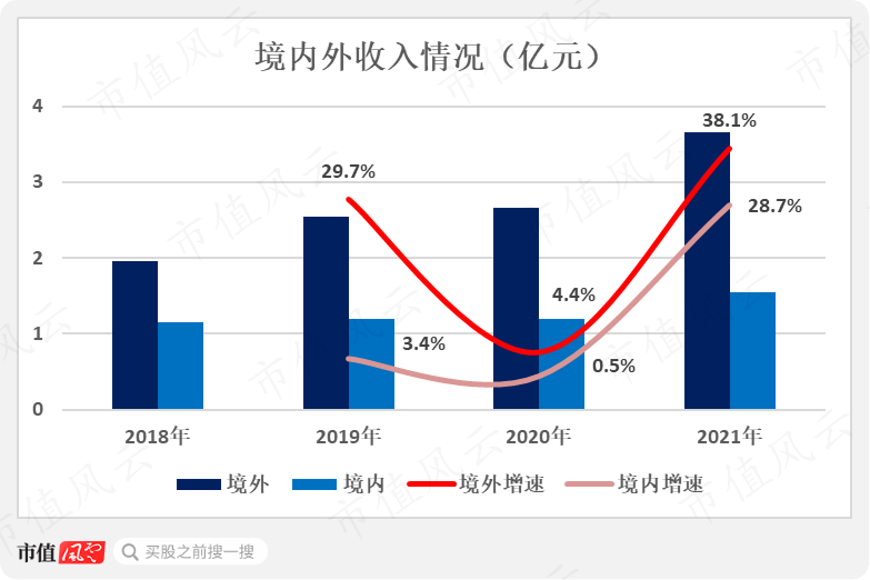不管是从收入规模还是收入增速上看,境外市场的重要程度都超过境内:公司2021年营收增长了1.35亿,境外收入增长1亿,贡献了增长的75%。