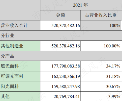 玉马遮阳的收入由三部分组成:遮光面料、可调光面料、阳光面料。三者占总营收的比重较为平均,各30%左右。