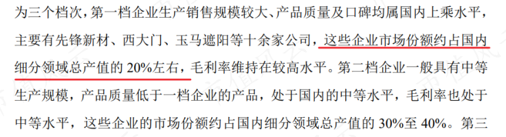 对于国内市场的竞争状况,从玉马遮阳的竞争对手西大门的招股书中可得知十余家第一梯队的建筑遮阳公司拥有20%的市场份额,其余的份额都被盈利能力相对较低的小企业、小作坊给瓜分。