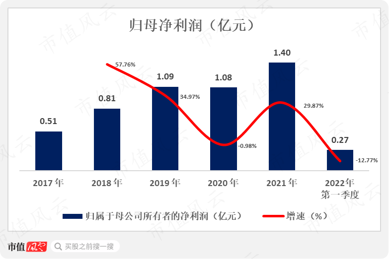 2021年度归母净利润1.4亿,增长接近30%,今年一季度则为负增长。