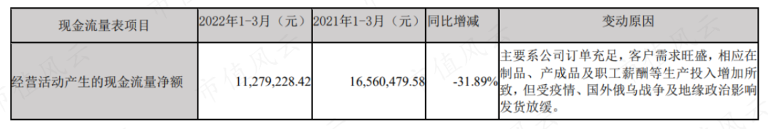 但是二者在今年一季度皆有所下降,其中经营活动现金流净额的数值下降较为明显,同比减少约32%。公司给出的解释是生产投入的增加以及俄乌战争导致的发货放缓。