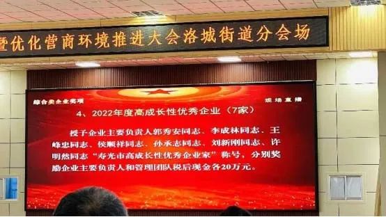 本次大会中,对2022年度产业发展表现突出的集体和个人进行了表彰,公司荣获2022年度高成长性优秀企业,董事长孙承志被评为2022年度“寿光市高成长性优秀企业家”称号。
