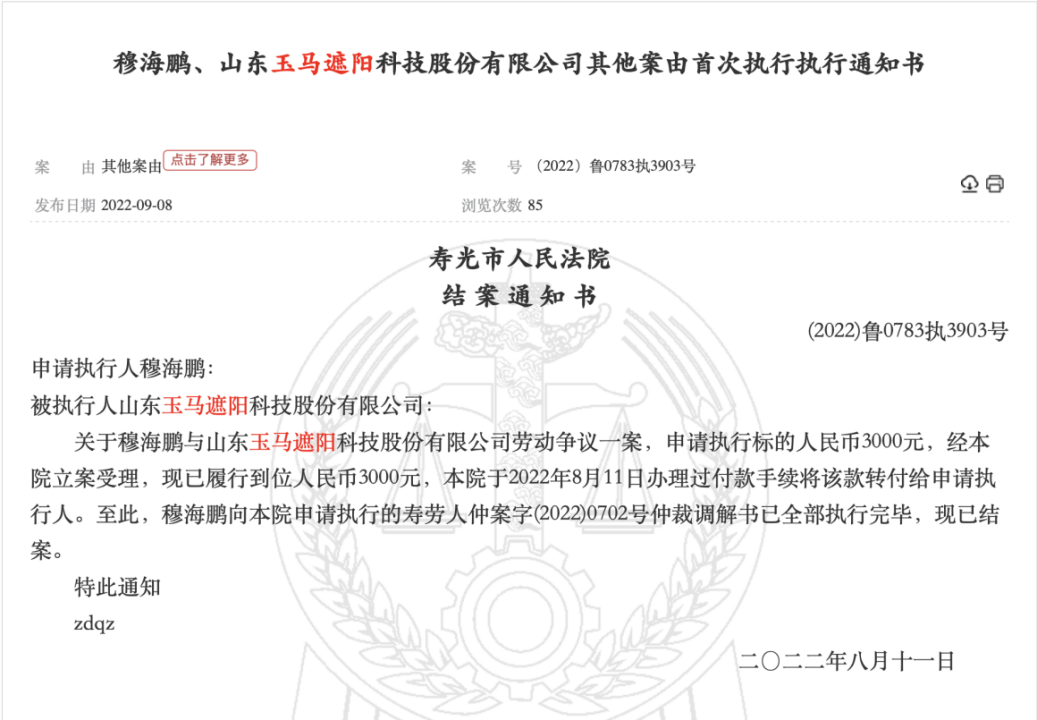 除此之外,在与前员工穆某的劳动争议中,玉马遮阳曾被列为被执行人,执行标的3000元。玉马遮阳履行到位后,寿光市人民法院曾发布结案通知书。