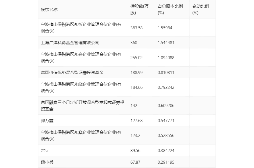 一季报显示,2024年一季度末公司十大流通股东中,持股最多的为宁波梅山保税港区永忻企业管理合伙企业(有限合伙),占比1.56%。在具体持股比例上,郭万鑫持股有所上升,宁波梅山保税港区永忻企业管理合伙企业(有限合伙)、宁波梅山保税港区永焱企业管理合伙企业(有限合伙)、贺兵、魏小兵持股有所下降。
