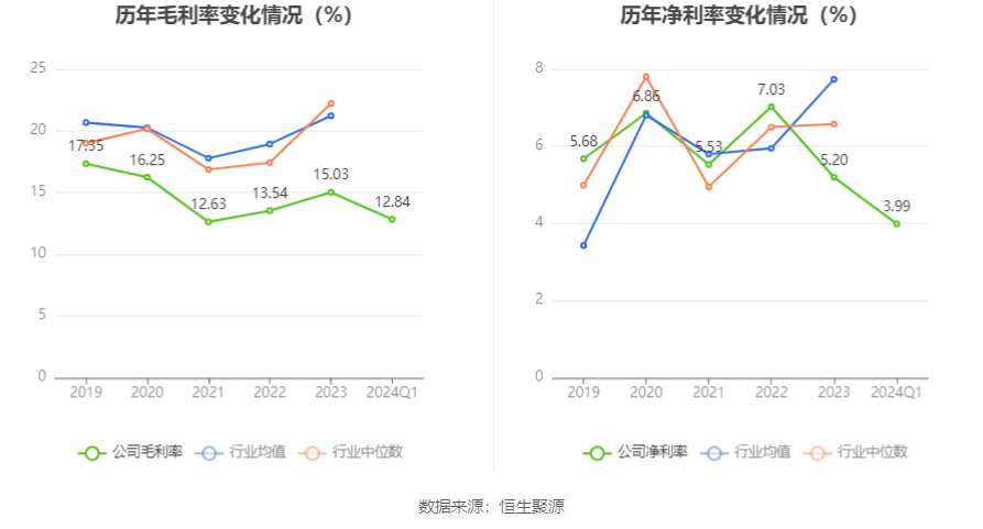 2024年第一季度,公司毛利率为12.84%,同比上升0.08个百分点;净利率为3.99%,较上年同期上升1.27个百分点。