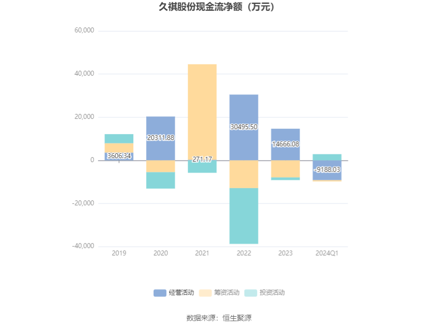 2024年第一季度,公司经营活动现金流净额为-9188.03万元,同比增加359.43万元;筹资活动现金流净额-580.85万元,同比增加45.15万元;投资活动现金流净额2872.59万元,上年同期为-2044.07万元。