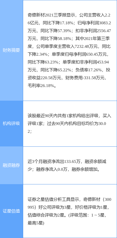 奇德新材公告,此次解除限售的股份数量为108.4811万股,占发行后总股本的1.289%,限售期为自股票上市之日起6个月;此次上市流通的限售股份为首次公开发行网下配售限售股;此次解除限售的股份上市流通日期为2021年12月6日。