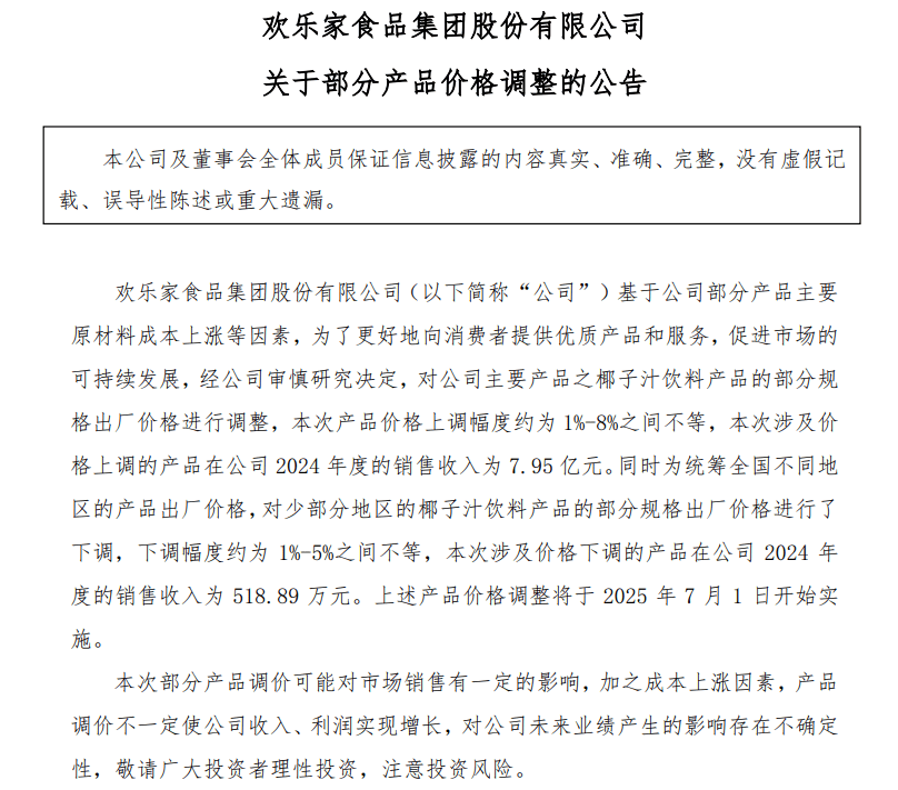 6月23日,欢乐家发布公告,因原材料成本上涨,公司决定对椰子汁饮料产品部分规格出厂价格进行调整,上调幅度约为1%-8%,本次涉及价格上调的产品在公司2024年度的销售收入为7.95亿元。