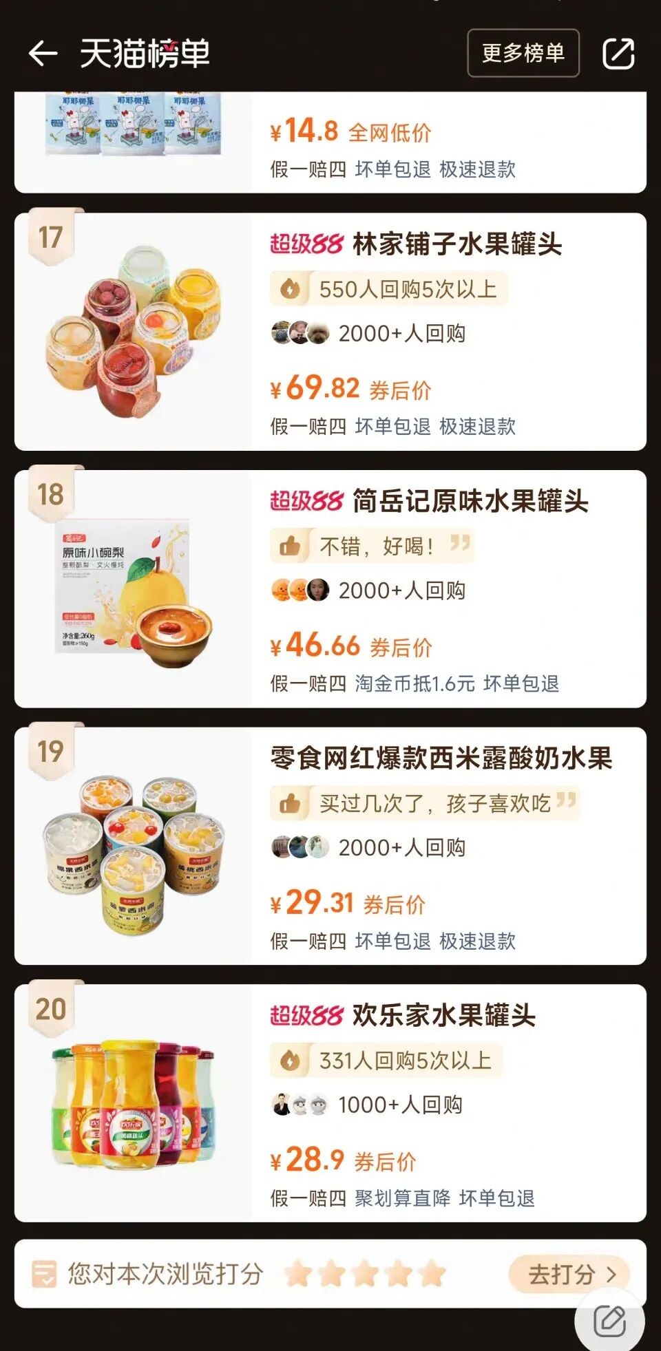 而天猫平台的“水果罐头”好评榜和回购榜里,销量前三分别是虹桥味泉黄桃罐头、林家铺子黄桃罐头、桃壹佰砀山黄桃罐头和虹桥味泉黄桃罐头、伊寻园黄桃罐头、应季物语果汁罐头,欢乐家只在天猫回购榜里排第20名。