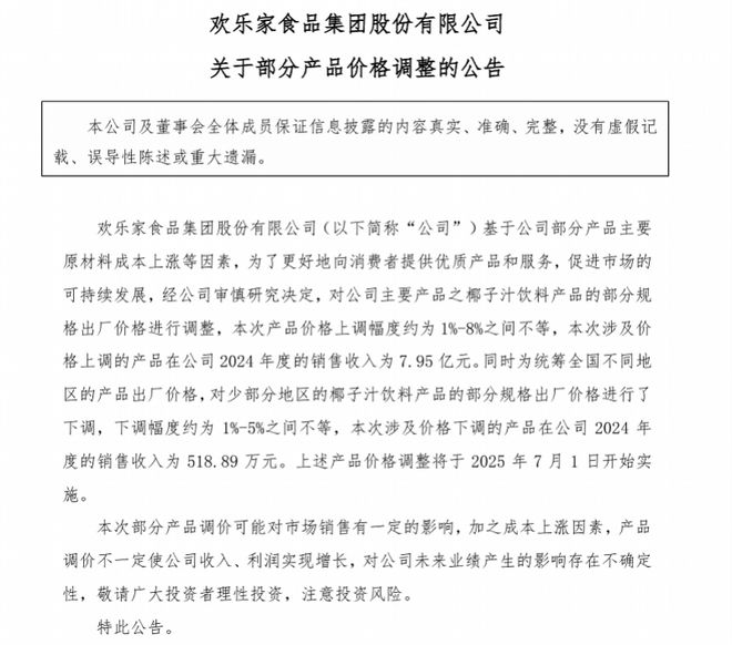 值得注意的是,今年6月,欢乐家曾宣布对部分椰子汁产品提价1%-8%,同时为统一价格,对小部分地区的椰子汁饮料产品的部分规格出厂价格进行下调,下调幅度约为1%-5%之间不等。价格调整于2025年7月1日开始实施,试图转移成本压力。但从三季报披露的数据来看,涨价策略收效甚微,成本涨幅远超终端提价空间。