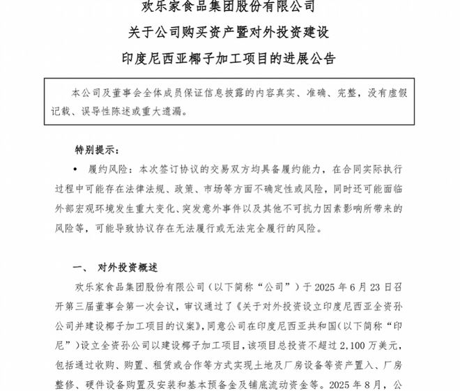 10月13日,欢乐家宣布通过印尼子公司以3871万元收购PRIMA COCO公司的土地、厂房及设备。这家成立于2019年的企业,拥有椰肉、椰水、椰奶等全系列加工能力,其“椰子肉加工制品”恰好契合欢乐家对椰肉原料的迫切需求。因此,这笔交易背后,是欢乐家对供应链自主权的终极争夺。