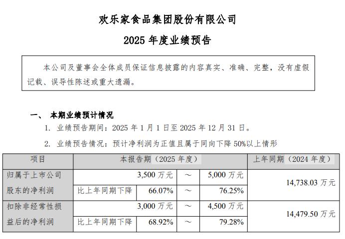日前,以罐头产品被众多消费者熟知的欢乐家(300997.SZ)发布2025年业绩预告,预计全年归母净利润为3500万至5000万元,同比下降66.07%至76.25%。这份业绩预告与2024年同期实现归母净利润1.47亿元形成鲜明对比。