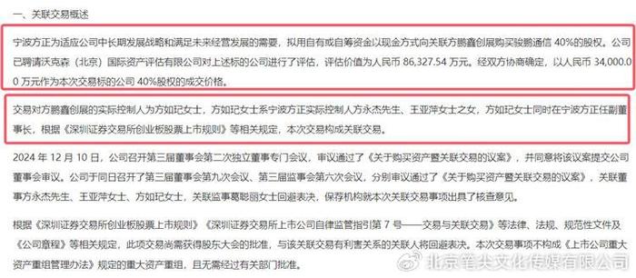 12月12日,宁波方正发布公告称,拟以3.4亿元现金向福建省鹏鑫创展新能源科技有限公司(简称“鹏鑫创展”)购买福建骏鹏通信科技有限公司(简称“骏鹏通信”)40%的股权。此次交易构成关联交易,因为鹏鑫创展的实际控制人方如玘是宁波方正实际控制人方永杰、王亚萍之女,同时也是宁波方正的副董事长,依据相关规定,此次交易构成关联交易。