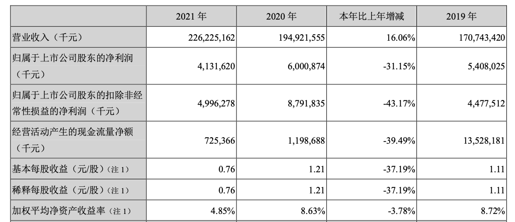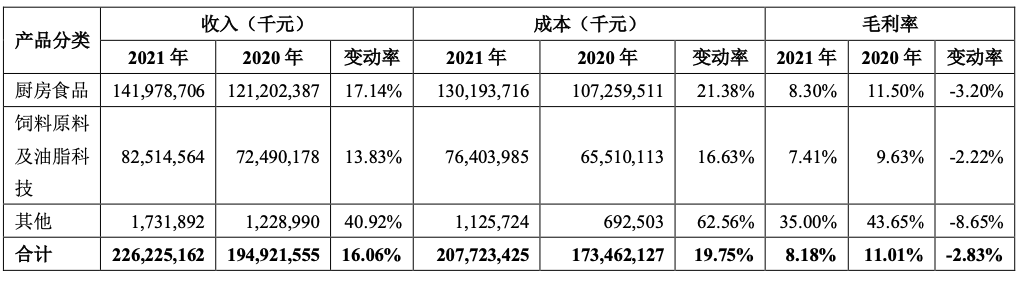 年报显示,2021年,金龙鱼实现营业收入2262.25亿元,同比增长16.1%;归属于上市公司股东的净利润41.32亿元,同比下滑31.1%。此外,总体毛利率下降2.83个百分点至8.18%,其中厨房产品毛利率下降3.2个百分点至8.3%,饲料原料及油脂科技产品毛利率下降2.22个百分点至7.41%。