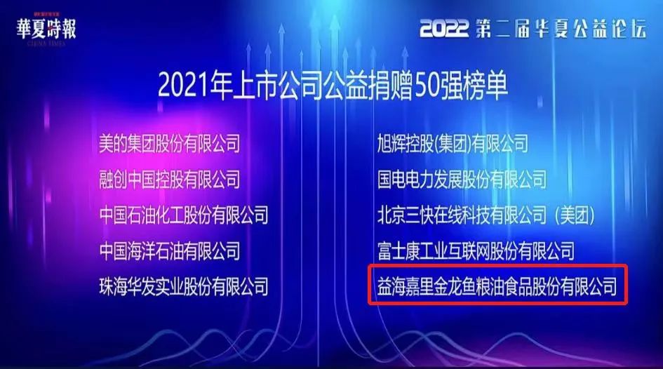 1月8日,由华夏时报社等主办的 2022 年度(第二届)华夏公益论坛在京举行。会上,益海嘉里金龙鱼入选“2021年上市公司公益捐赠50强”,同时,金龙鱼慈善公益基金会入选“2022 年度十大华夏公益基金会”。基金会自成立以来,坚持发展成果与社会共享,开展扶贫资助、教育帮扶、人才培养等,不断探索创新慈善公益模式。经过十年的摸索积累,逐步形成了以“益海嘉里助学工程、金龙鱼烹饪班、高校教育捐助、金龙鱼复明工程、抚孤助残、赈灾济困”为主的六大模块慈善公益项目,以多重模式践行社会责任,回馈社会发展。