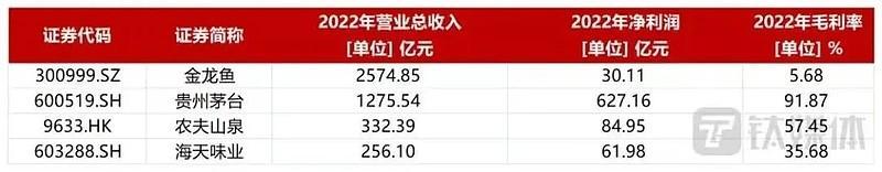没有对比就没有伤害,同期的贵州茅台营业收入为695.76亿元,大约只有金龙鱼营收的一半,但贵州茅台的归母净利润高达359.80亿元,是金龙鱼的37倍多。