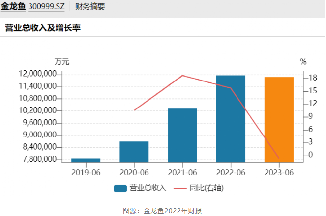 遭遇近16万股民年底灵魂拷问的背后,是金龙鱼2023年没有带来回报信号。据纳食了解,金龙鱼2023年半年报显示,报告期内,公司实现营业收入1187.14亿元,同比下降0.64%;净利润9.66亿元,同比下降51.13%;扣非净利润0.14亿元,同比下降99.4%;基本每股收益0.18元,较上年同期的0.36元大降50%。这是自2010年上市以来交出的最差的一份中报。值得一提的是,2023年上半年不同以往在净利润下降的同时,其营业收入也在微降。