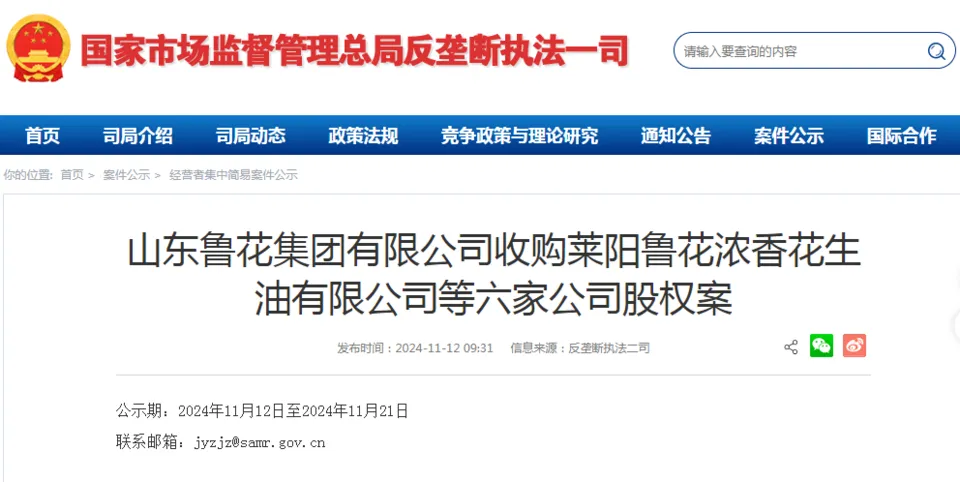 11月份,据国家市场监督管理总局官网信息,山东鲁花集团有限公司收购莱阳鲁花浓香花生油有限公司等六家公司股权案进行经营者集中简易案件公示。交易完成后,鲁花集团将单独控制六家目标公司。
