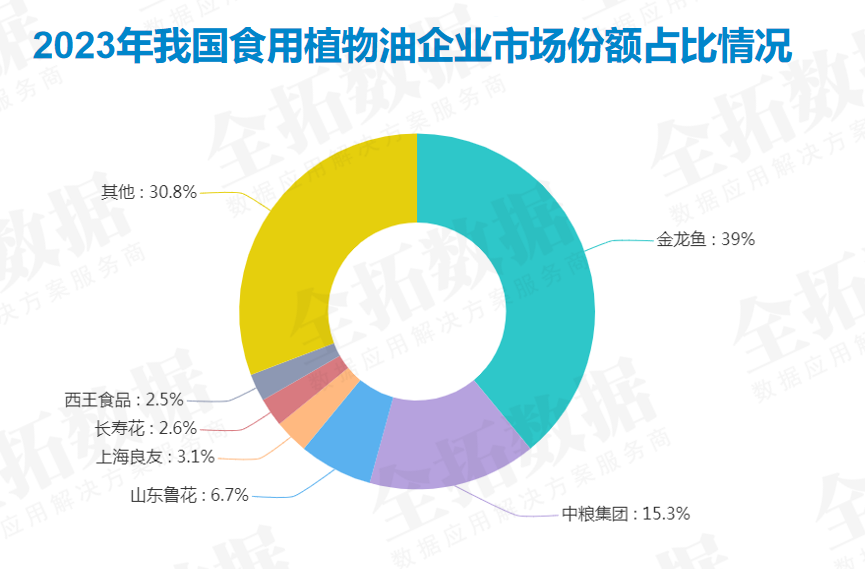 据全拓数据统计,金龙鱼、中粮集团、山东鲁花、上海良友、长寿花市场规模占比位居前五,分别为39.0%、15.3%、6.7%、3.1%、2.6%。