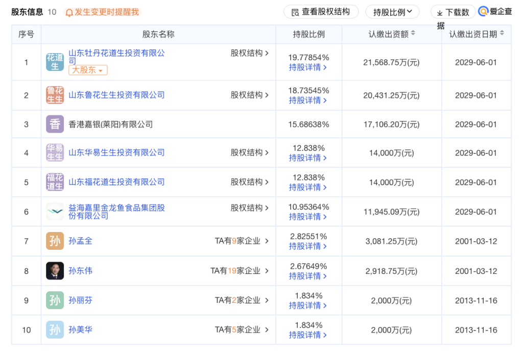 据显示,山东鲁花第一大股东为山东牡丹花道生投资有限公司,该公司实控人为孙孟全,持股比例100%;第二大股东为山东鲁花生生投资有限公司,实控人为孙东伟,持股比例100%。根据公开资料,孙孟全与孙东伟为父子关系。此外,孙孟全和孙东伟还持有山东鲁花2.83%和2.68%股权。