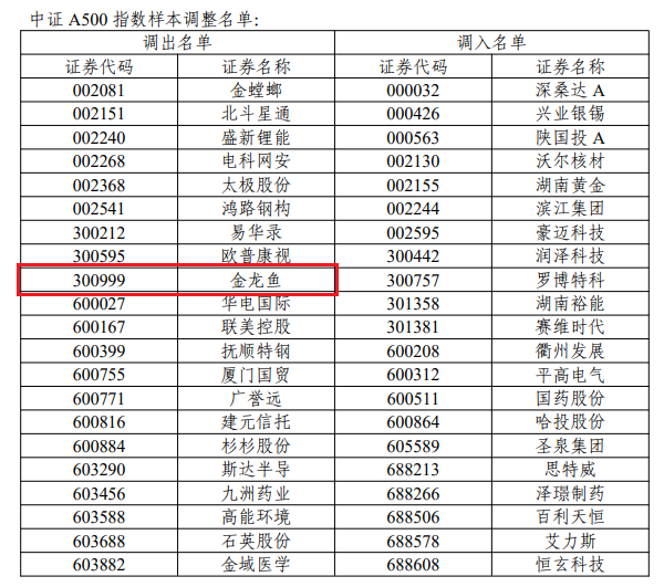 中国经济网北京6月17日讯上周五收盘后,沪深300、中证500、中证1000、中证A500等指数定期调整生效。其中,金龙鱼(300999.SZ)位列中证A500指数样本调出名单。