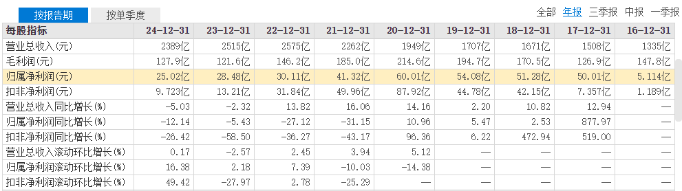 金龙鱼近4年归母净利润与扣非净利润连续下滑。2020年至2024年,金龙鱼营收分别为1949亿元、2262亿元、2575亿元、2515亿元、2389亿元,归属净利润分别为60.01亿元、41.32亿元、30.11亿元、28.48亿元、25.02亿元,扣非净利润分别为87.92亿元、49.96亿元、31.84亿元、13.21亿元、9.723亿元。