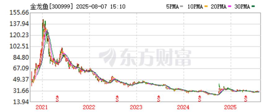 上市初期,有“油茅”之称的粮油头部上市企业金龙鱼曾被资本市场热捧,2020年10月登陆创业板后,股价一度从发行价25.7元/股飙升至145.62元/股,公司市值巅峰时逼近7900亿元。截至2025年8月7日下午收盘,金龙鱼股价为30.29元/股,总市值1642亿元,与2021年市值最高7900亿元相比,蒸发超6000亿元。