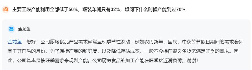 对于产能利用率较低的问题,金龙鱼曾在互动平台上对市场投资者解释称,厨房食品产品需求通常呈现季节性波动,例如农历新年、国庆、中秋等节假日期间的需求会远高于其前后的月份。为了保持产品的新鲜度以及降低存储成本,该公司基本是按旺季需求来规划产能,因此在旺季时产能接近满负荷。但这一解释难以完全说明为何全年产能利用率如此之低,尤其是在金龙鱼不断扩建生产基地的情况下。