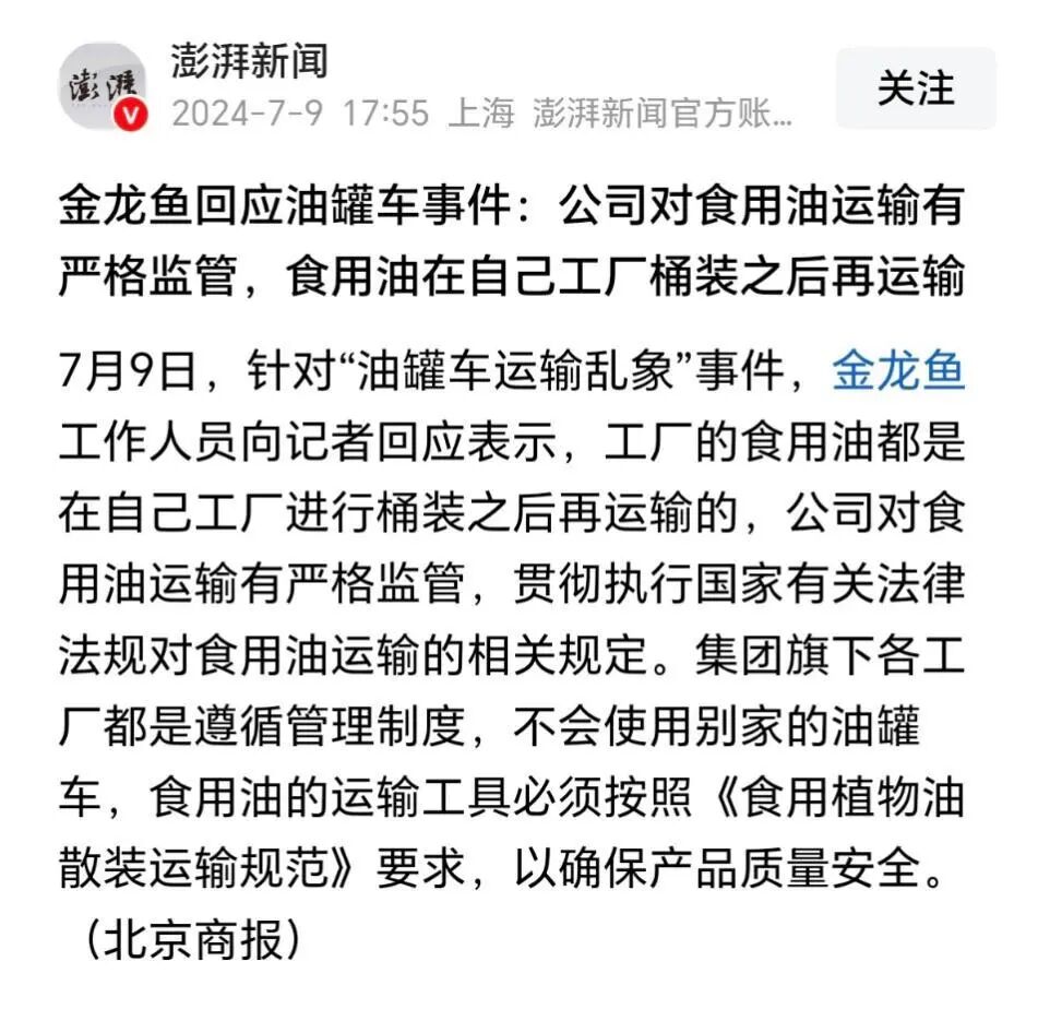 2024年7月,媒体曝光金龙鱼工厂存在油罐车未清洗即装载食用油的情况。前湖北首富兰世立通过自媒体持续发声质疑,尽管后续检测显示油品合格,但这场与个人长达数月的法律拉锯战,让品牌形象不断受损。