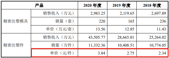 招股说明书显示,肇民科技2018年至2020年精密注塑件单价为2.34元/件、2.75元/件和3.84元/件。