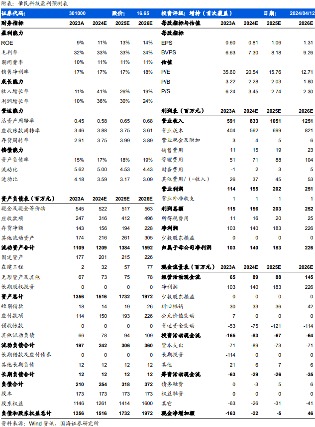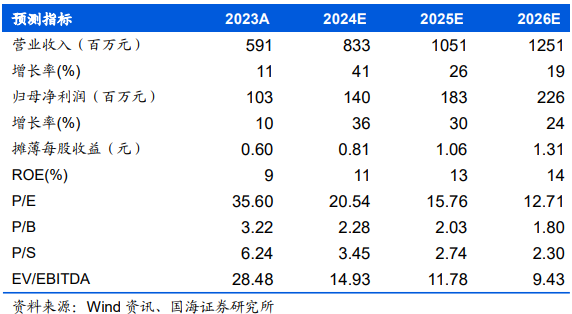 未来汽车业务有望成为公司增长主要动力,人形机器人业务或将贡献增量,我们预计公司2024-2026年实现营业总收入8.33、10.51、12.51亿元,同比增速为41%、26%、19%;实现归母净利润1.4、1.83、2.26亿元,同比增速为36%、30%、24%;EPS为0.81、1.06、1.31元,对应当前股价的PE估值分别为21、16、13倍,考虑到公司覆盖多个新能源头部客户,未来增长可期,首次覆盖,给予“增持”评级。