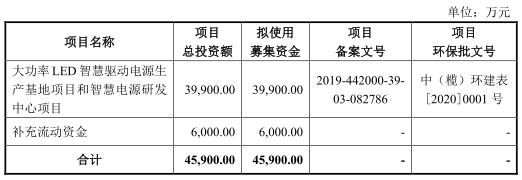 崧盛股份最终募集资金净额比原计划少5780.26万元。崧盛股份2021年5月31日披露的招股说明书显示,公司拟募集资金4.59亿元,分别用于大功率LED智慧驱动电源生产基地项目和智慧电源研发中心项目和补充流动资金。