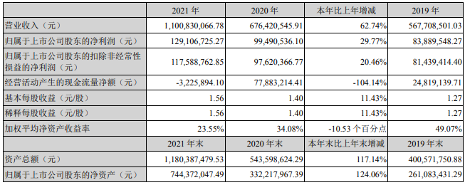 根据该公司3月26日最新发布的2021年年度报告,报告期内,公司实现营业收入11.01亿元,同比增长62.74%;归属于上市公司股东的净利润1.29亿元,同比增长29.77%;基本每股收益1.56元,同比增长11.43%。