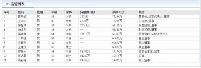 此外,公告还显示了公司各位高管薪资情况,董事长田年斌和总经理王宗友去年从公司获得的报酬一样,都是79.94万。此外,两人持有的公司股份也一样,是2302万股。
