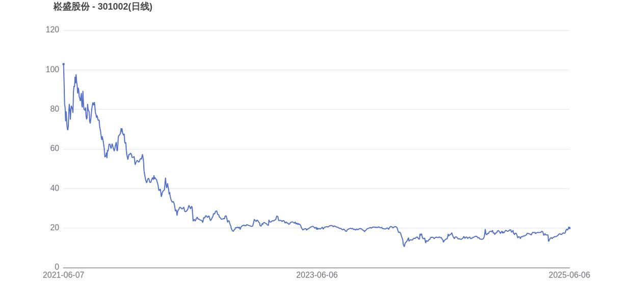 2021年6月7日,崧盛股份的市值巅峰达到99.87亿元,股价也顺应升至105.66元。而至6月6日收盘,崧盛股份的股价为20.02元,市值为24.60亿元,相比峰值时期市值减少75.27亿元,市值蒸发了75.37%。